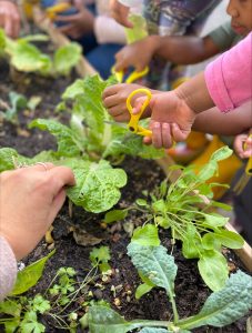 Photo: Children cutting lettuce at Moore Park Child Learning Center. Impact Reports Harvesting and Community