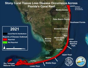 Stony coral tissue loss disease was first identified in 2014 near the Port of Miami and spread throughout Florida’s Coral Reef by 2021, and at least 16 countries in the Caribbean, most recently Roatan, Honduras. The pathogen(s) have not been identified but an alphabet soup of federal, state, and local governments, nonprofits, and the University of Florida are working non-stop to defeat stony coral tissue loss disease. Zoos and aquariums throughout the US are holding rescued corals to preserve genetic diversity. While the situation is urgent, it is