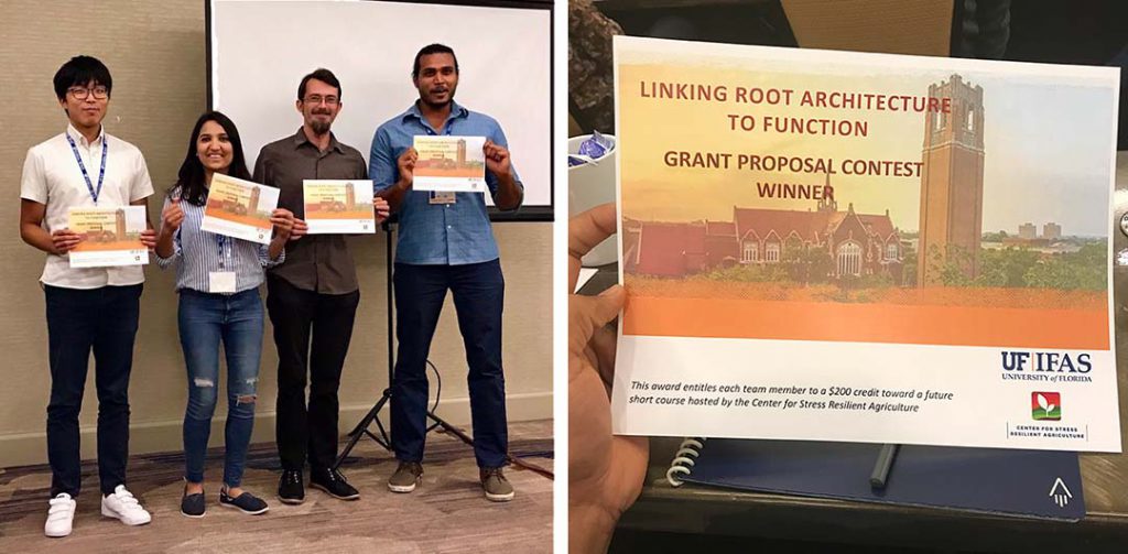 MREC graduate student Yuvraj Khamare won a mock grant proposal and $300 travel grant from the University of Florida short course entitled Linking Root Architecture to Function. Khamare worked with three other graduate students to create a mock $1 million grant proposal related to linking root architecture with root structure.
