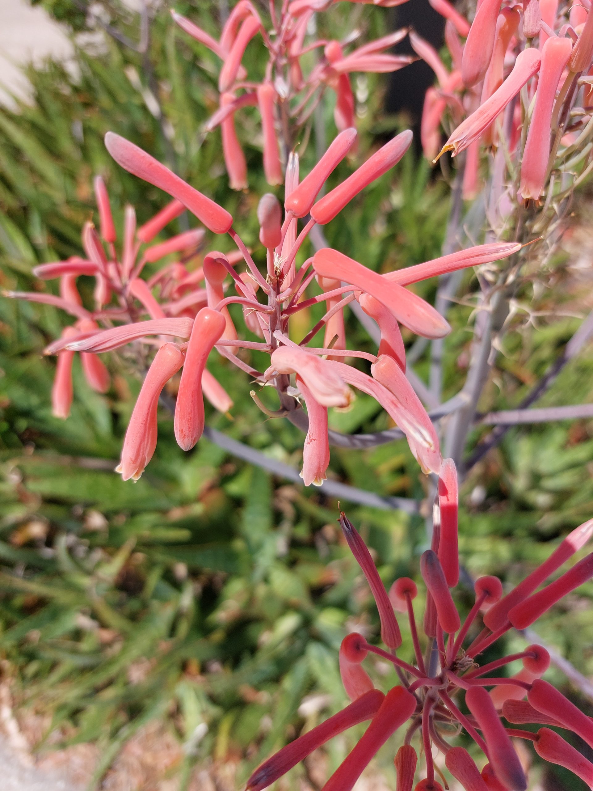 Above: Mother of millions (Kalanchoe x houghtonii) carpeting an area and displacing native plants (left) and its flowering stage (middle and right). Its flowers are pink or light red on a tall stalk. It reproduces by seeds, “pups”, and stems that can re-root.