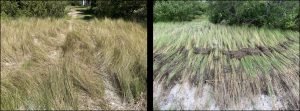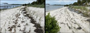 At Joe Rains Beach LS, where vegetation is well established, soils showed little or no evidence of erosion and vegetation was only temporarily laid down, but rarely uprooted. The low marsh at G Street LS and Airport Road LS were also minimally affected due to wave protection at lower water from Reef Prisms and Reef Balls. In contrast, the high marsh and adjacent dune at Airport Road LS had some significant erosion resulting in 3-5 horizontal feet of sand being lost along with Sea Oats, Seaside Goldenrod and Bitter Panicum. Additional erosion in the high marsh of both sites resulted in Saltmeadow Cordgrass being partially uprooted or lost.