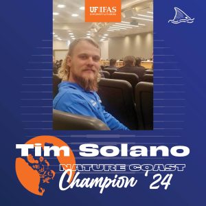 Despite his busy role as a young father of three, Tim remains dedicated to his community, helping with coastal clean-up efforts and Cedar Key’s beautification. His leadership and commitment to both the aquaculture industry and his community make him a true Nature Coast Champion.