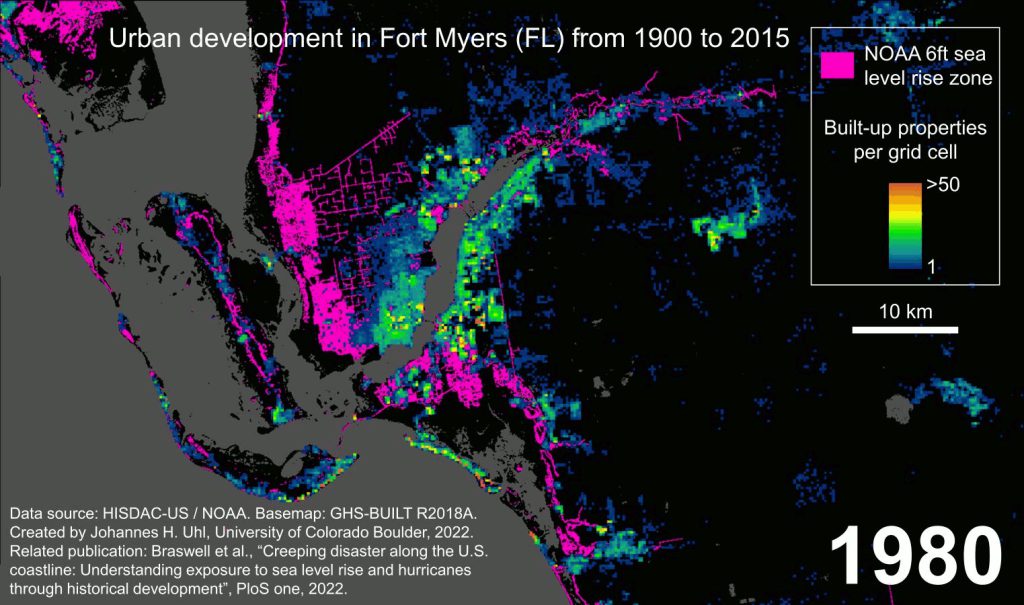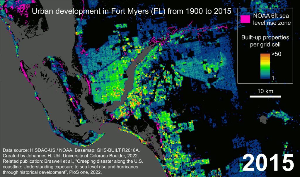 “This study is the first to look at how building trends over the last century and sea level rise projections converge on a national scale,” said University of Florida researcher Anna Braswell, first author of the study now published in the journal PLOS One.