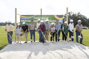 Rain left a two-inch puddle on the floor of the UF/IFAS Extension Gilchrist County office Wednesday. It was a fitting reminder of the Trenton structure’s age, and one remarked upon repeatedly Friday by speakers at a ceremonial groundbreaking for its future replacement, a 20,000-square-foot building adjacent to the county agriculture complex in Bell.