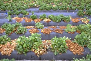 The fungus that causes the disease hides in native vegetation around strawberry fields, then moves with the rain and winds of tropical storms and hurricanes and can kill strawberry plants.