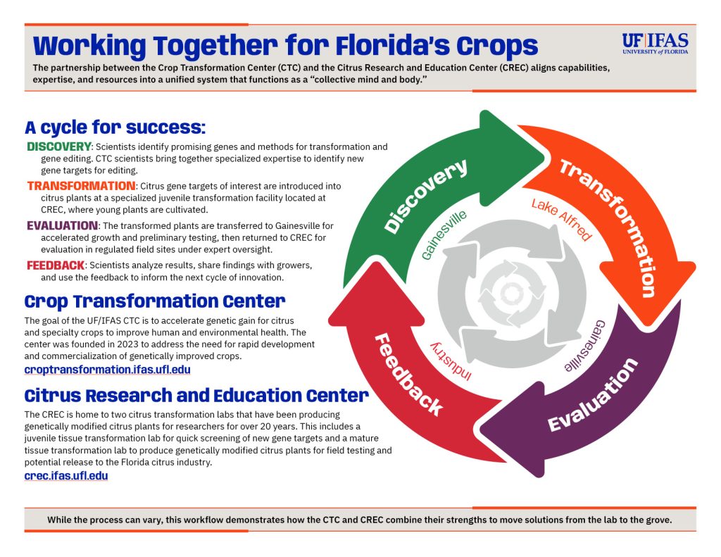 “The more shots on goal, the more likely you are to find a winner,” he said. “Those discoveries made in Gainesville will likely progress through the pipeline back and forth between Gainesville and CREC, which is better positioned to handle citrus transformations — at this time.”