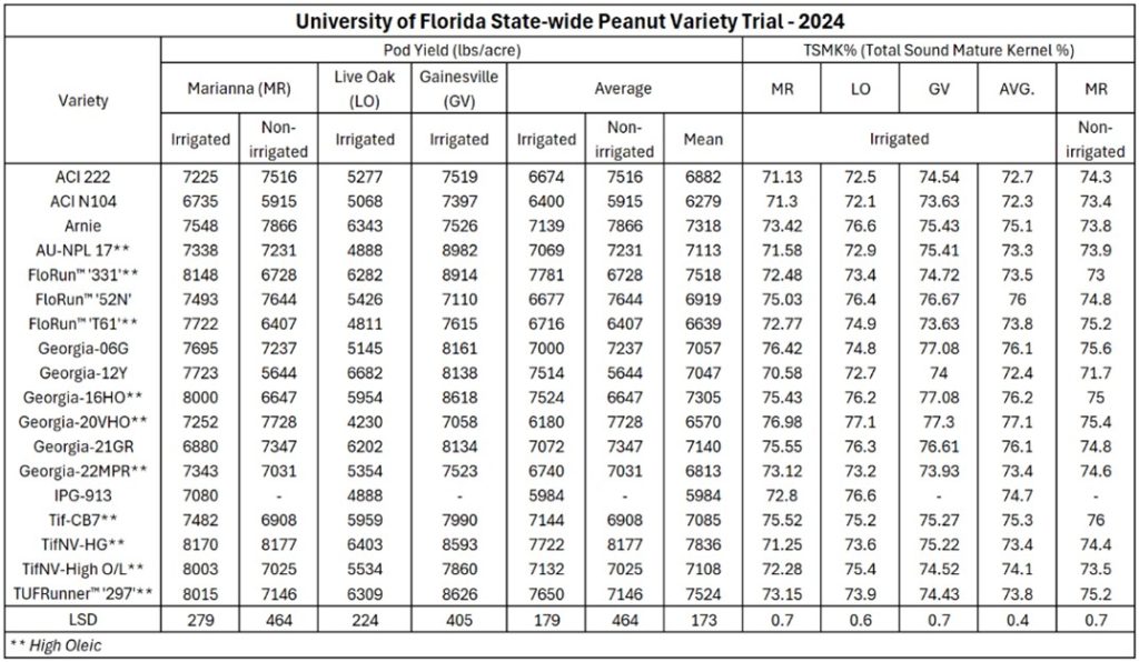 The Suwannee Valley of northern Florida has a long history of peanut farming. In recent years, approximately 50,000 to 90,000 acres of peanuts have been harvested annually in the Suwannee Valley (USDA-NASS).The region’s warm climate and sandy, well-drained soils provide a good environment for growing peanuts. Given current production costs and market outlook, however, making a profit on peanuts will be challenging in 2025 (Athearn and University of Georgia). Understanding the details of peanut production from soil preparation and seed selection to pest management and harvesting is essential for a productive and profitable operation. This blog explores some of the key factors that growers should consider when choosing a peanut variety in the Suwannee Valley.