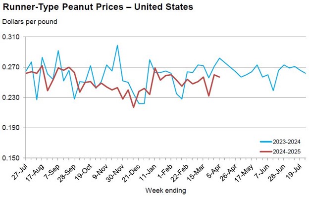 Figure 2 shows the national average price for runner-type peanuts so far this marketing year (red line) compared to last marketing year (blue line). Prices have been similar to last year. The national average price reported for runner-type peanuts was $0.257/lb ($514/ton) for the week ending April 5th, according to USDA-NASS data.