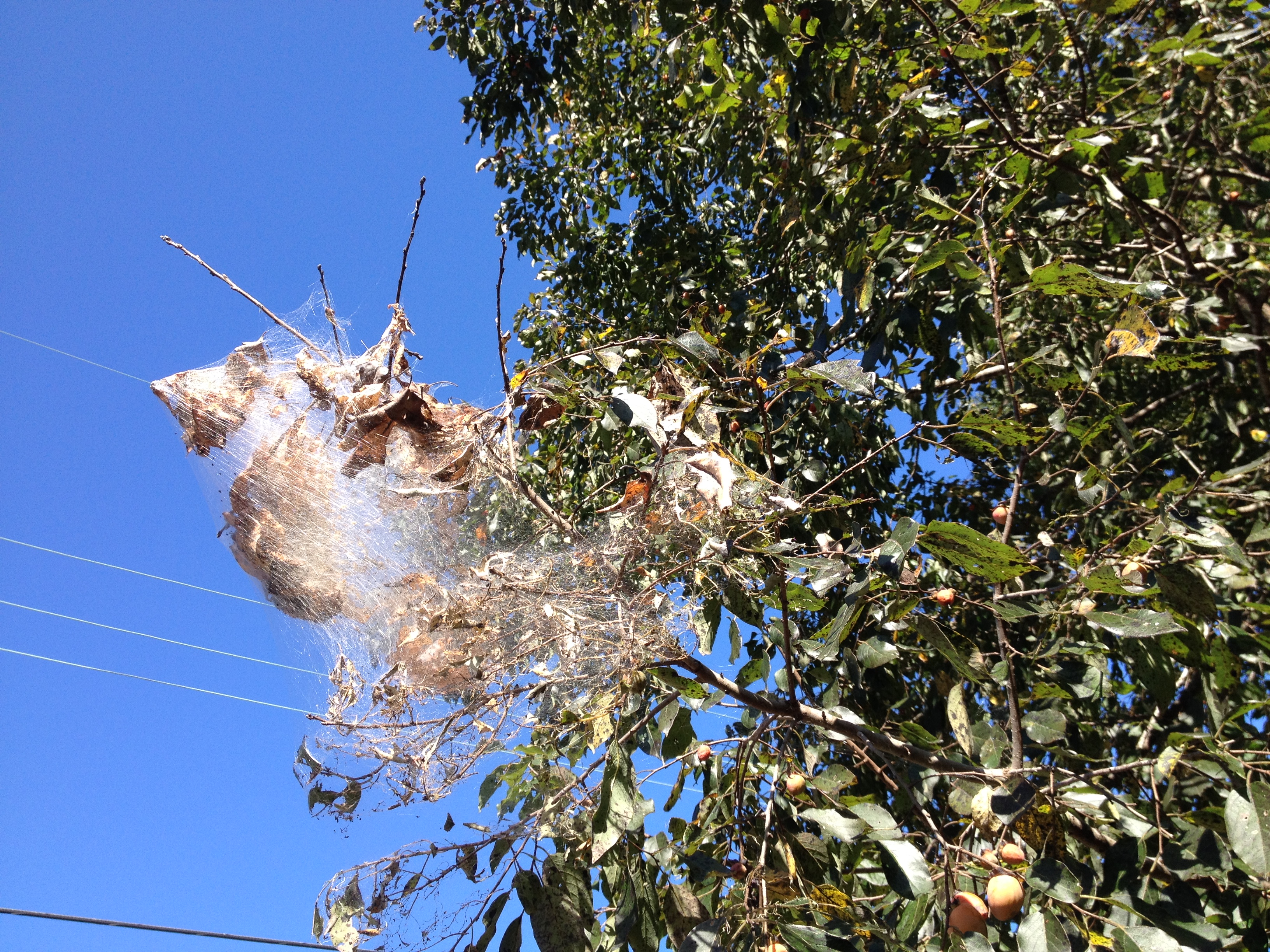 Webworms enclose leaves and ends of branches with silken webbing. The worms (caterpillars) are found in this protective webbing consuming leaves. Although they can defoliate branches on which they are feeding, very little to no permanent damage is done. It’s more of an aesthetic problem.