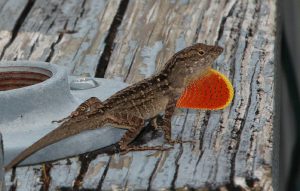 The brown anole, a lizard native to Cuba and the Bahamas, first appeared in the Florida Keys in 1887. Since then it has moved northward becoming established in nearly every county in Florida. By hitching a ride on boats and cars, as well as, hanging out in landscape plants being shipped throughout the state, the Cuban anole (Anole sagrei) has become one of the most abundant reptiles in Florida. However, the native Carolina green anole (Anole carolinensis) has been impacted.