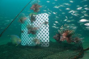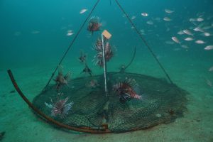 For the past several years, researchers have been working to develop a trap that may be able to harvest lionfish from deep water. Dr. Steve Gittings, Chief Scientist for the Office of National Marine Sanctuaries at the National Oceanic and Atmospheric Administration, has spearheaded the design for a “non-containment” lionfish trap. The design works to “bait” lionfish by offering a structure that attracts them. The trap remains open while deployed on the sea floor, allowing fish to move in and out of the trap footprint. When the trap is retrieved, a netting is pulled up around the fish inside and they are brought to the surface.