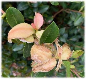 The fungus Exobasidium vaccinii causes leaves and flowers to become swollen or thickened, curled and waxy in appearance. This fungus causes leaves, and in some cases flower petals, to enlarge abnormally and is commonly referred to as azalea or camellia leaf and flower gall.