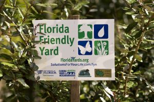 Florida Friendly Yard sign. Shrubs, yard, landscaping, Florida Friendly Yard. UF/IFAS Photo: Tyler Jones.