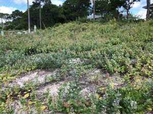 So, why is this plant so problematic? Well, dune erosion present in areas dominated by beach vitex results from the production of a non-fibrous taproot. Many of our native dune stabilizing species hold our coastal dunes together through their fibrous root systems. Furthermore, this plant actually induces a hydrophobic chemical response in the sand that essentially draws water away from native plants, thereby creating unfavorable conditions for native seeds to germinate and flourish. Even worse, these chemicals can persist in the sandy dunes for up to 3 years.