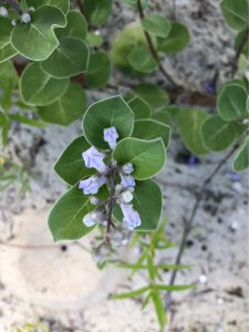 Beach vitex is low-growing, woody, perennial shrub with quickly spreading branches. Reports have also indicated that this plant can grow upward, reaching heights of nearly 3 feet, taking on more of a bush-like growth habit. Extremely salt and drought tolerant, it thrives on the surface of sandy dune areas. Its opposite, rounded leaves have a slightly spicy aroma when crushed and, unlike other Vitex species present in Florida, have a notable white pubescence on the underside of leaf surfaces.