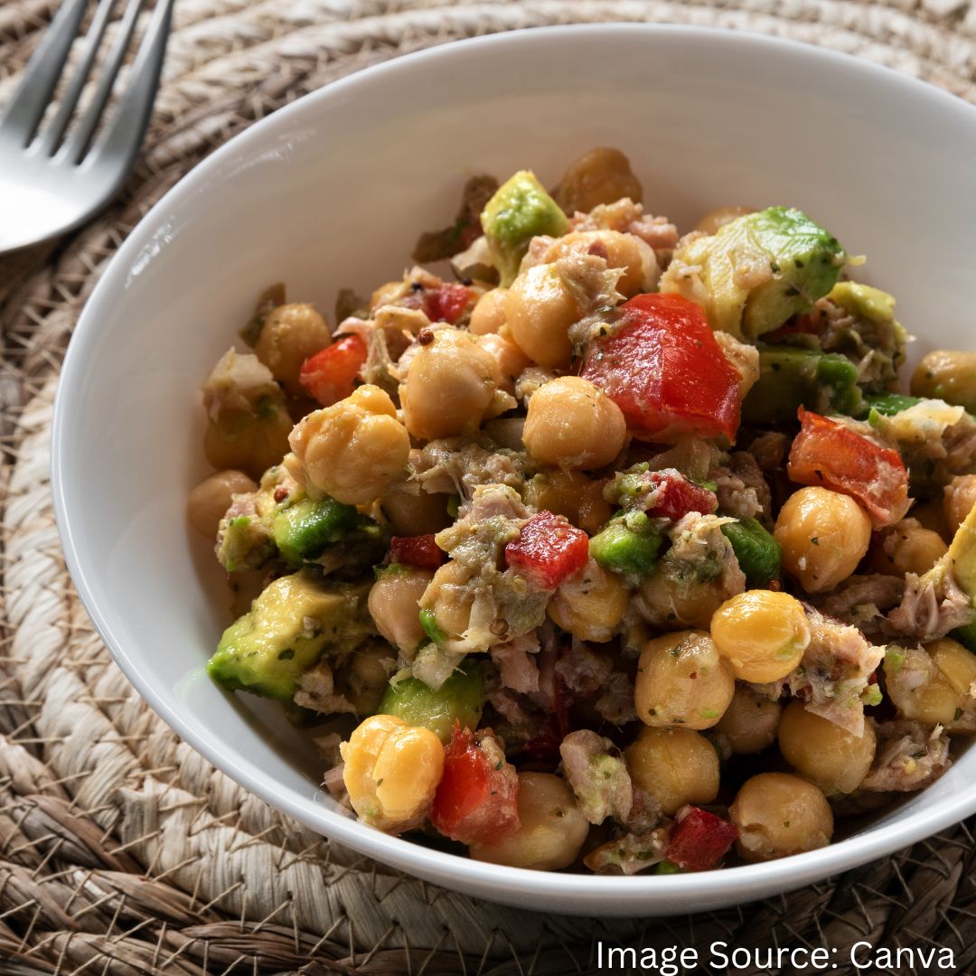 - In a large bowl, combine the tuna, chickpeas, and diced tomatoes.