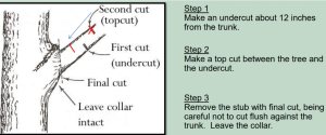 - At this point you should have a long stub connected to the trunk left, with the cut from the first step still on the branch. Cut the branch from the trunk without damaging the trunk tissue. Do not cut the branch collar where it connects to the trunk.