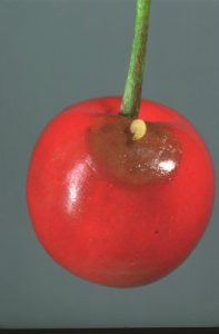 Pitted marks on fruits are noticeable after oviposition. As larvae develops, damage on fruits appears as brown, rotted legions.