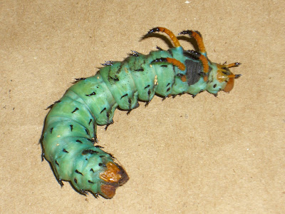 This imposing larva (caterpillar), known as the hickory horned devil, is most often observed when it is full grown and comes down from the trees to wander in search of a site for pupation. It can beome as large as a hot dog.
