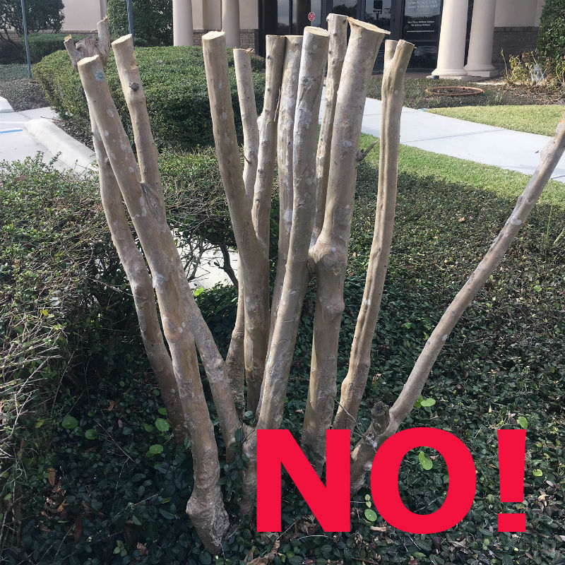 Remember when considering pruning your crapemyrtle trees, do not be guilty of “crape murder”! The practice of severely pruning back crapemyrtle trees is not recommended. (For information on proper pruning techniques for crapemyrtle trees, see University of Florida Publication, “Crapemyrtle Pruning”, ENH1138.)