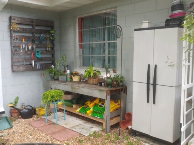 Gardeners, are you tired of propagating your plants by kneeling on the ground, and running back and forth to the garage for pots, potting soil and tools? Create your own “office” – your own efficient work center – a potting bench. You’ll be glad you did! Happy Gardening!