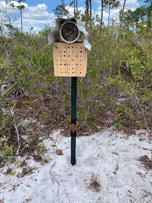 Photo credits used with permission: Blue Calamintha Bee specimen from Florida Museum of Natural History; Ashe’s calamint (Calamintha ashei) and bee nest boxes. Photos by Chase Kimmel.