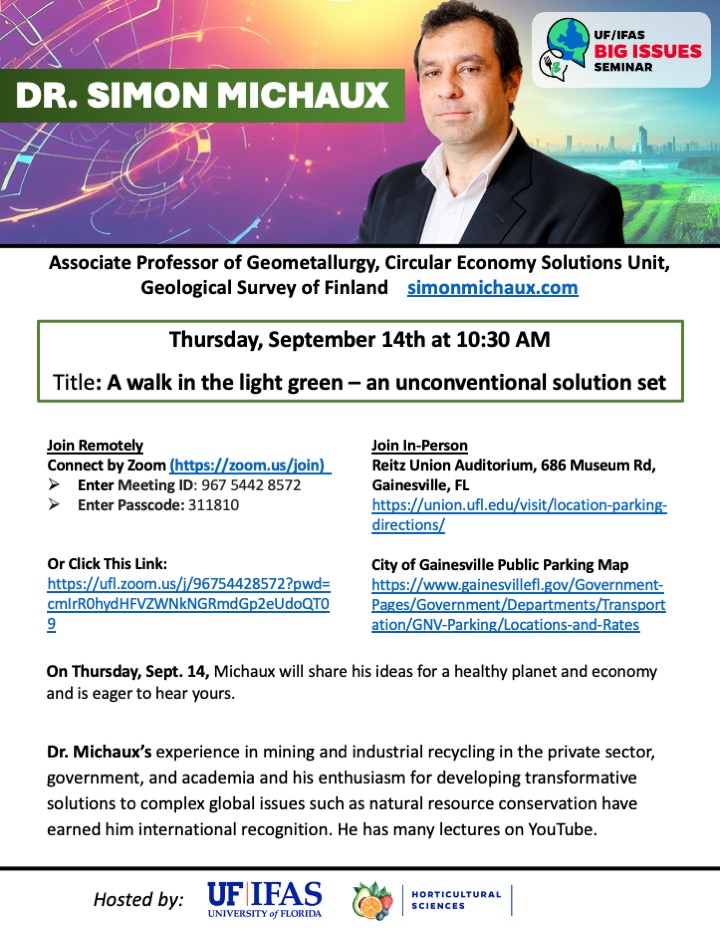 Dr. Michaux’s experience in mining and industrial recycling in the private sector, government, and academia and his enthusiasm for developing transformative solutions to complex global issues such as natural resource conservation have earned him international recognition. He has many lectures on YouTube.