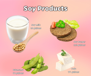 While soy milk has a low water footprint, soy burgers require more water due to additional ingredients and processing. Edamame, an immature soybean, has a footprint of 64 gallons per four ounces.