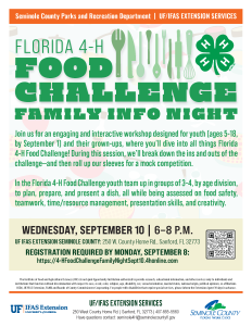 Join us for an engaging and interactive workshop designed for youth (ages 5-18) and their grown-ups, where you’ll dive into all things Florida 4-H Food Challenge! During this session, we’ll break down the ins and outs of the challenge—and then roll up our sleeves for a mock competition. Join us for a 4-H Food Challenge Family Night on Wednesday, September 10. Register at: https://4-HFoodChallengeFamilyNightSept10.4honline.com