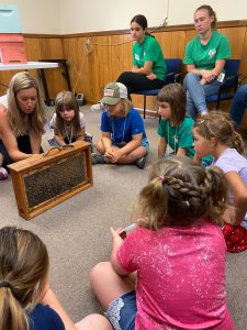 Campers started their day learning about an unlikely farm friend – pollinators! While pollinators may not be the first animal that comes to mind when you think of farms, they certainly are one of the most important. Pollinators play a major role in agriculture and food production, making them the perfect “farm friend” to start with. Campers learned about different types of pollinators, the pollination process, and created pollinator-related crafts. The pollinator lesson was finished off with an up-close look at honeybees thanks to Ms. Molly LaRocca, beekeeper at Bikini Bee Company. Ms. LaRocca shared her knowledge of bees, demonstrated the different products that honeybees produce, and offered hands-on learning experiences for the campers.