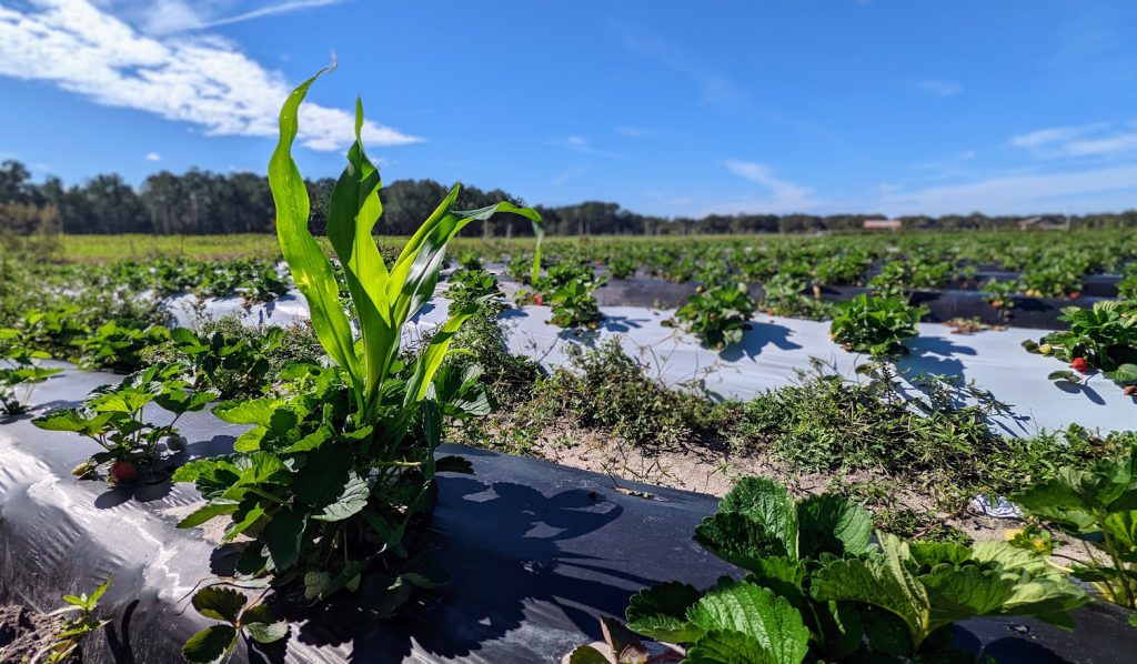 There are several ways to treat weeds, and one way that farmers do is by the use of pre-emergent herbicides. These chemicals are applied to the ground before weed seeds germinate. They have exceptionally good adsorptive properties, meaning that they stick to soil particles very well. After a light watering, form a long-lasting protective coating just below the surface. Growers wait for when daytime temps warm to between 65° and 70°F for 4-5 consecutive days to treat spring weeds, and when nighttime temperatures fall to 55° to 60°F for 4-5 consecutive days to treat winter weeds. These temps are just right for the weed seeds to open up and send new weeds to the surface. However, along the way, they run into the herbicide barrier and are killed before they ever reach the surface. This practice not only saves labor but also reduces the amount of herbicides that have to be applied throughout the growing season. However, if a large enough rain event – like a tropical storm – takes place, the pre-emergent herbicide loses it’s effectiveness. This is what happened in the picture to the weeds right next to the plastic.