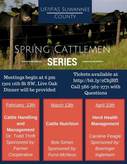 The Spring Cattlemen Series is a three part series covering cattle management and handling, cattle nutrition, and herd health. Each meeting will begin at 6pm at the UF/IFAS Suwannee County Extension Office at 1302 11th St SW, Live Oak, FL, 32046.