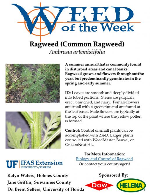 Combining mechanical and chemical methods of control is often useful with ragweed. Mowing can exhaust reserves, but can also disperse seeds. Glyphosate resistant types have been reported in other states, but not yet in Florida. To decrease the likelihood of this happening, overuse of such herbicides should be minimized. Other options of chemical control include Weedmaster, Banvel, and GrazonNext.