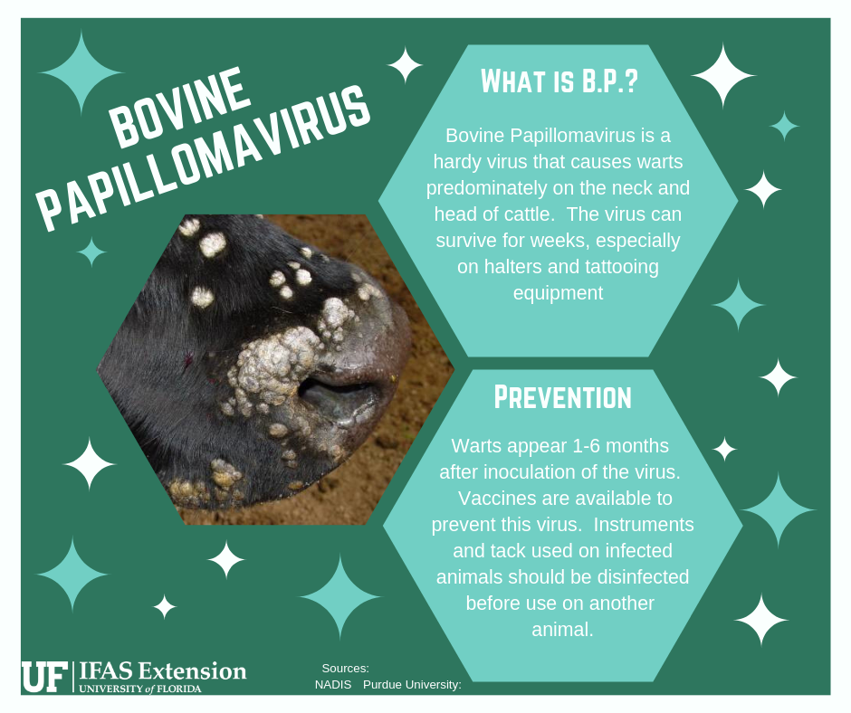 Bovine papillomatosis is caused when cattle become infected with bovine papillomavirus. Physically observable symptoms are produced primarily by two of the four types of the virus which can survive for weeks or months in the environment. This virus is highly infectious and calves are very susceptible to it. BPV primarily enters the animal through skin that has been cut or abraded. Bovine papillomatosis most often expresses itself as skin lesions or warts. However, cattle can still be carriers of the virus without showing observable symptoms. BPV can cause cancer of the upper gastrointestinal tract and papillomas (benign epithelial tumors that project outward) may develop on the teats, udder, and penis of cattle.