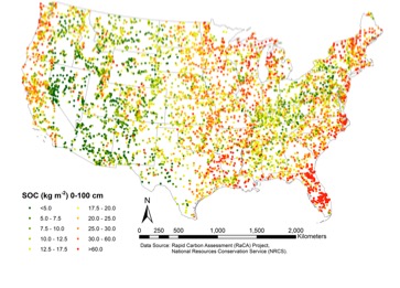 Soils may act as a source or sink for atmospheric CO2 but the uncertainty related to accurate assessment of the spatial variation of soil carbon in the U.S. is still very high. To fill this research gap we assessed soil organic carbon stocks across the U.S. A gridded soil carbon model was produced using soil organic carbon observations, remote sensing and GIS datasets. We found that soil organic carbon is controlled by a mix of soil, geologic, climatic and hydrologic/moisture environmental covariates and to lesser extent by biotic and topographic variables.