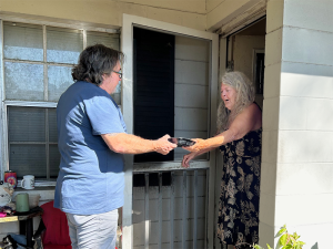 “She said the dog was checking me out,” he laughed, referring to her small dog that greeted him at the door. Whiles got to pet the dog, who gave him an approving sniff before heading back inside.
