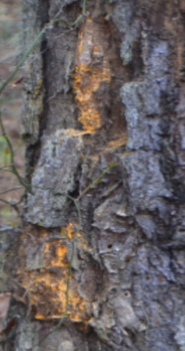 Pine sap leaks or weeps from the gall giving it the moist appearance of a septic wound. Opportunistic insects and the fungus cause this condition.