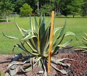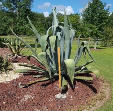 To plan the bed consider what kind of plants you want to use and each one’s mature size. Agaves come in a wide range of sizes, the most common being the Century plant, Agave americana. This plant grows to at least 6 ft. tall and 8 ft. wide. The thick massive grey-green leaves have sharp spines along the edges and tips. This is a plant that you DO NOT want to have to work around, so it needs lots of room. In Mexico and Central America, it is used for fencing and forms an impenetrable barrier to keep cattle and people out. It is extremely drought tolerant. It might show a slight bit of damage if we have a hard freeze, but is typically hardy throughout Zone 8 (Wakulla County).
