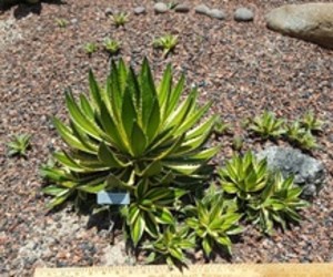 The Agave lophantha ‘Quadricolor’ grows to only 12 inches tall and 18 inches wide and has greens, yellow, and cream striped leaves. It produces an abundance of ‘pups’ or offspring.