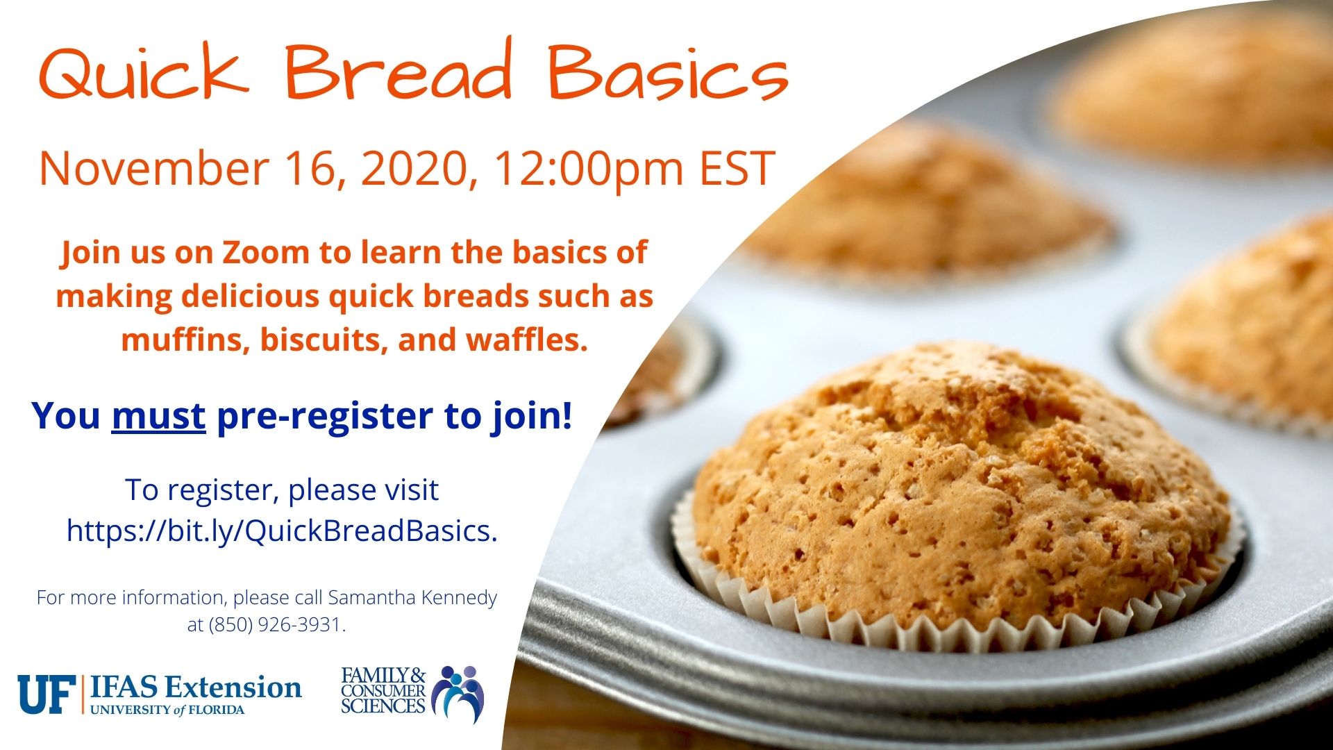 Join us on Zoom on Friday, November 16, 2020 at 12:00pm EST to learn the basics of making delicious quick breads such as muffins, biscuits, and waffles.