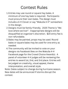Since 2021, Wakulla 4-H has invited the community to participate in annual Haybale Decorating Contest. The contest is always held to coincide with National 4-H Week, October 5 -11, 2025. The theme for the week is “Beyond Ready”. The week aims to rally, inspire, and connect 4-H members, volunteers, and alumni, highlighting 4-H’s role in preparing youth for life and careers. In Wakulla County, we invite the community to celebrate everything “fall” with us – from football, Halloween, and more. To bring a unified element to everyone’s creativity, we encourage all entries to feature something 4-H related. This feature can be the letters 4-H, a four leaf clover, or it can depict children wearing 4-H gear!